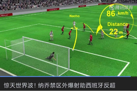 而对于没有取得新媒体版权的一众媒体平台,以腾讯体育为例,笔者发现其在对世界杯赛事进行报道时采用动画的形式还原精彩片段,并附加更多相关数据,已属变通方式中的优选。