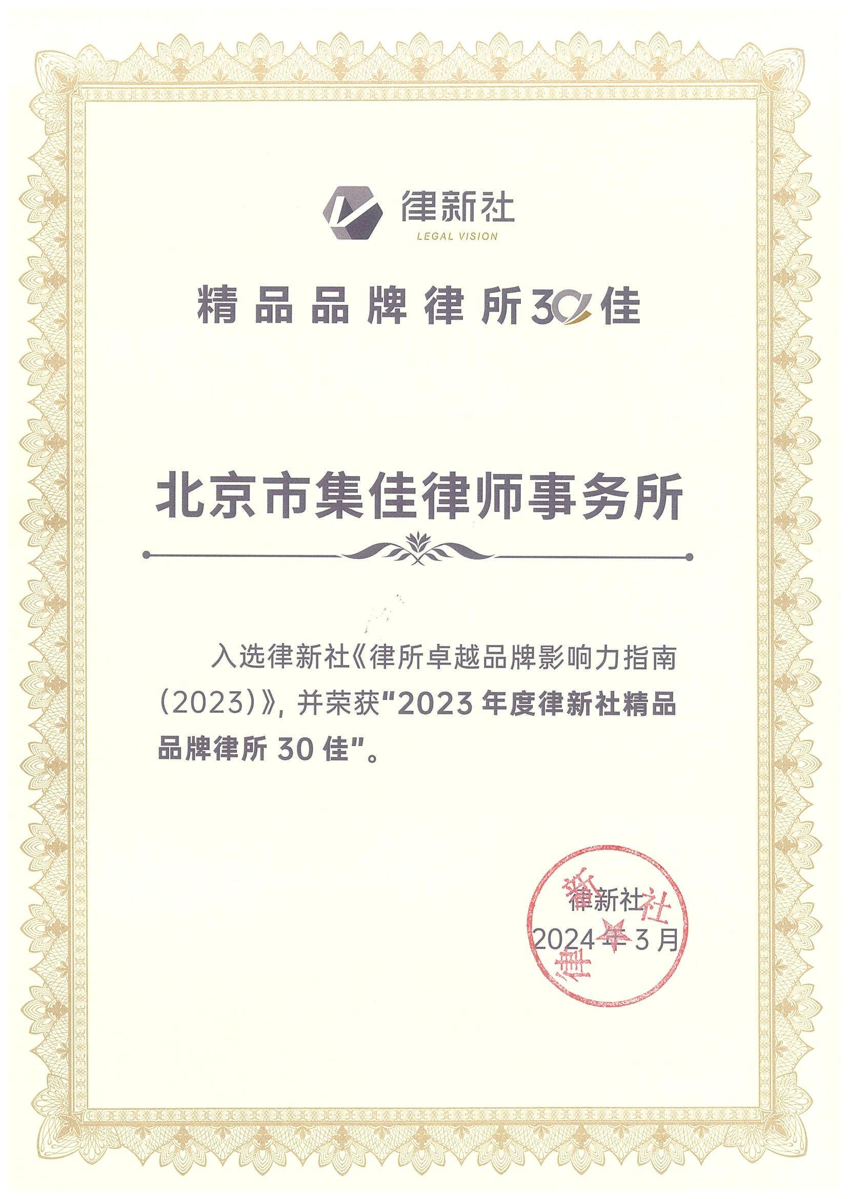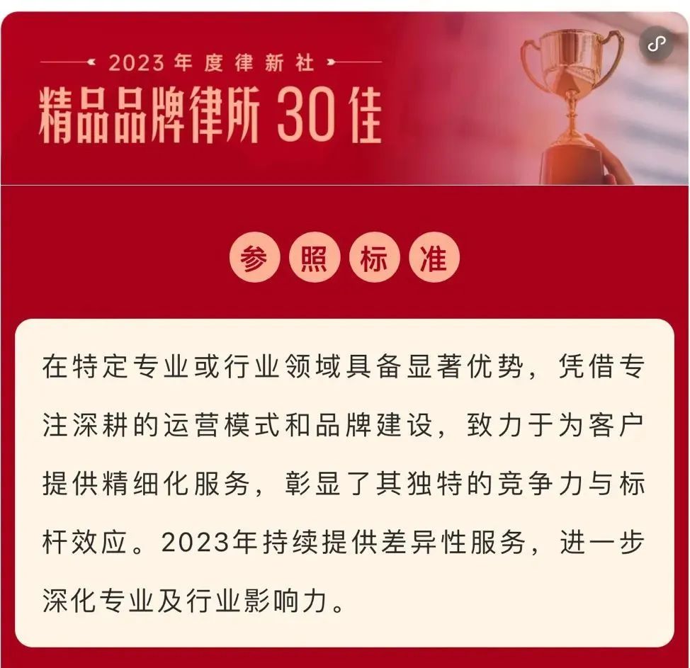 2024年3月2日,由中国法学交流基金会指导、律新社主办的“致·追光者”第二届法律服务业品牌发展论坛暨律新社2023年度品牌盛典隆重举行,现场发布了备受关注的《律所卓越品牌影响力指南(2023)》,c7娱乐凭借在知识产权领域的卓越实力和良好口碑,荣登“2023年度律新社精品品牌律所30佳”榜单。